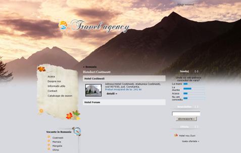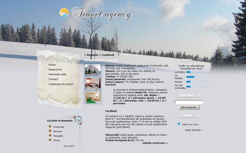 Proiectarea unui astfel de site web are cateva aspecte pe care se concentreaza. Primul se refera la oferirea informatiilor importante: siteul prezinta agentia de turism, meniul, detaliile de contact, etc. Urmatorul aspect este posibilitatea de a face rezervari online, pentru un anumit hotel si o anumita perioada. De asemenea, site-ul este bine organizat fiind conceput si proiectat utilizand produse precum: Adobe Photoshop, Aptana, Xampp.
