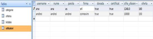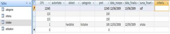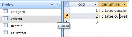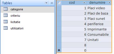 Baza de date se numeste licitatii.mdb si vom avea 4 tabele: