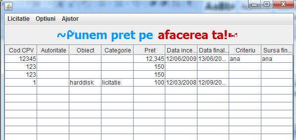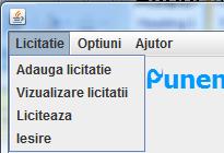 Dupa deschiderea aplicatiei utilizatorul poate acceasa din interfata meniurile care au diferite optiuni:adaugare,vizualizare,liciteaza