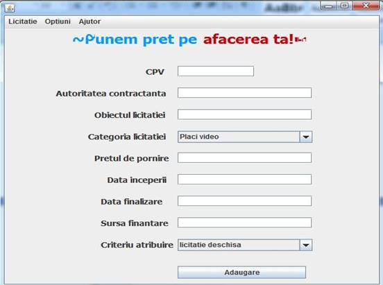 La adaugare licitatii utilizatorul va trebui sa completeze campurile :sa ii ofere licitaiiei un cod unic,sa aduge obiectul,sa specifice categori,data inceperii,data finalizarii,tipul(criteriul licitatiei) si pretul de pornire.