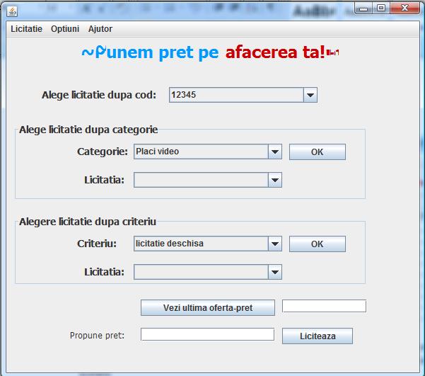 In optiunea de Liciteaza utilizatorul paote alege o licitatie dupa criteriu,dupa categorie sau dupa cod,sa vada ultimul pret licitat iar apoi daca doreste sa liciteze.