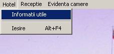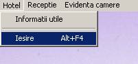 Iesirea din program se face prin selectarea butonului Iesire , aflat in cadrul aplicatiei "Hotel" din meniu sau prin combinatia de taste ALT+F4.