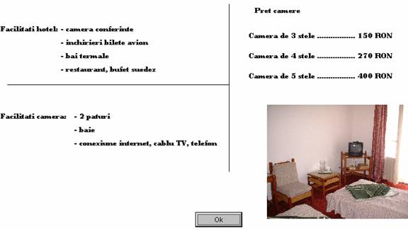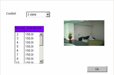 Dupa cum usor se poate observa , pretul difera de la o camera la alta, pe masura ce cresc stelele cu care sunt cotate aceste camere!Revenirea la meniul principal se face cu ajutorul butonului " ok ".