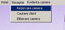 In cazul in care un nou client doreste sa se cazeze intr-una din camerele hotelului, utilizatorul programului va accesa butonul "Receptie" din programul principal!Astfel,selectand prima optiune din cadrul acestui buton,"Rezervare camera",se va putea face rezervarea unei noi camere!