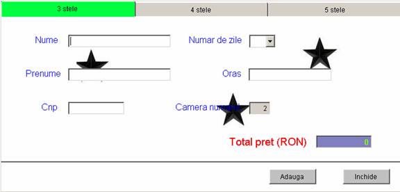 Odata cu selectarea acestei optiuni va aparea o noua fereastra ce va permite utilizatorului introducerea noului client!Avantajul acestei ferestre este acela ca,se poate selecta tipul de camera cerut de client!Astfel diferentierea camerelor se face usor prin selectarea numarului de stele dorit!