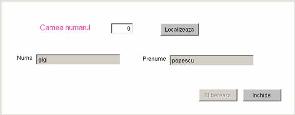 Se va introduce numarul camerei ce se doreste in vederea utilizarii!Prin apasarea butonului Localizare , va fi prezentat statusul camerei!Daca nu este ocupata,va fi afisat un mesaj de avertizare!Daca este ocupata,prin apasarea butonului Elibereaza , va fi eliberata.
