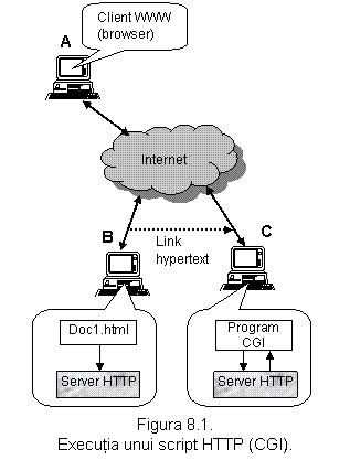 Programul (scriptul) CGI poate fi executat (figura 8.1) in locul unde se aflǎ memorat (C) si rezultatul sǎu este transmis clientului (A) care a activat link-ul din documentul Doc1.html primit de la calculatorul B.