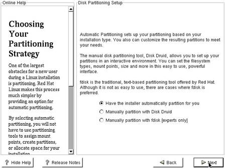 Acum sunteti inrebati ce instrument de partitionare veti folosi. Cea mai simpla metoda este utilizarea Disk Druid. O alta optiune este fdisk-ul.