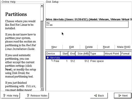 Partitionarea discurilor este un pas foarte important deoarece modificarea ulterioara a partitiilor nu ofera foarte multa siguranta in fata posibilitatii pierderii de date. De aceea fiti foarte atenti la acest pas al instalarii. Programul de instalare va afisa un ecran ca cel prezentat in FIG 2.1.