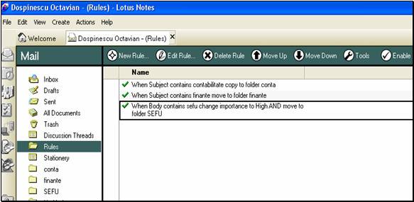Ei, si acum intervine notiunea de rule (regula) in suita Lotus. Utilizatorul poate stabili o regula care din punctul lui de vedere ar suna cam asa: Daca mesajul pe care l-am primit in Inbox se refera la proiectul de la Contabilitate, atunci sa fie copiat automat in folderul CONTA. Cu litere mai proeminente am evidentiat de fapt elementele definitorii ale regulii: conditia si efectul.