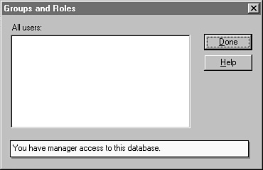 Rolul pe care il aveti in ACL este afisat in partea de jos a casetei. Daca sunteti un membru al unui grup care are acces sau aveti roluri specifice intr-o baza de date, acestea vor fi de asemeni listate in caseta de dialog. Deoarece este o baza de date locala si nu ati modificat ACL, ar trebui sa fiti listat ca Manager si nu ar trebui sa fie alte roluri in lista.