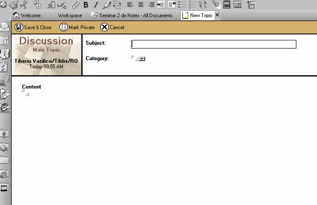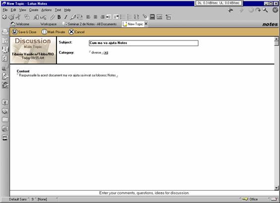 Pentru a invata cum putem sa cream documente, vom incepe cu baza de date Discussion. Formularele din aceasta baza de date sunt simple si discutiile sunt printre cele mai utilizate aplicatii Notes. O baza de date Discussion poate fi folosita de un workgroup pentru a dezvolta o idee, sau poate fi o zona unde oamenii cu interese comune se pot intalni in ciberspatiu. Pentru necesitatile noastre, baza de date va fi utilizata pentru a discuta ceea ce sperati sa realizati folosind Lotus in organizatia voastra.