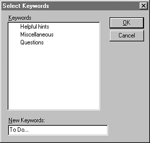 In aceasta lista de dialog, selectati cuvantul cheie dorit, apoi faceti clic pe OK. Puteti de asemeni sa introduceti cuvinte cheie folosind tastatura, iar Notes va insera cuvantul cheie de indata ce veti tasta suficiente caractere pentru a diferentia selectia fata de celelalte cuvinte cheie.