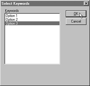 In baza de date Discussion, ati gasit un exemplu de cuvinte cheie dialog. Cuvintele cheie nu sunt afisate pe ecran decat daca cursorul este plasat in campul respectiv si apasati Enter sau faceti clic pe butonul de ajutor. Cand deschideti lista de dialog, o caseta este afiseata pe ecran cu o lista de cuvinte (figura 8).