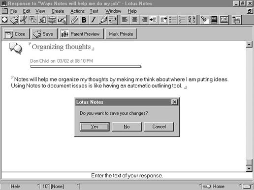 Daca au fost facute schimbari in document de cand a fost salvat ultima oara, Notes afiseaza o fereastra de dialog (figura 11) Faceti clic pe Yes pentru a salva documentul. Faceti clic pe No pentru a abandona schimbarile. Faceti clic pe Cancel pentru a va reintoarce in document si a continua editarea.
