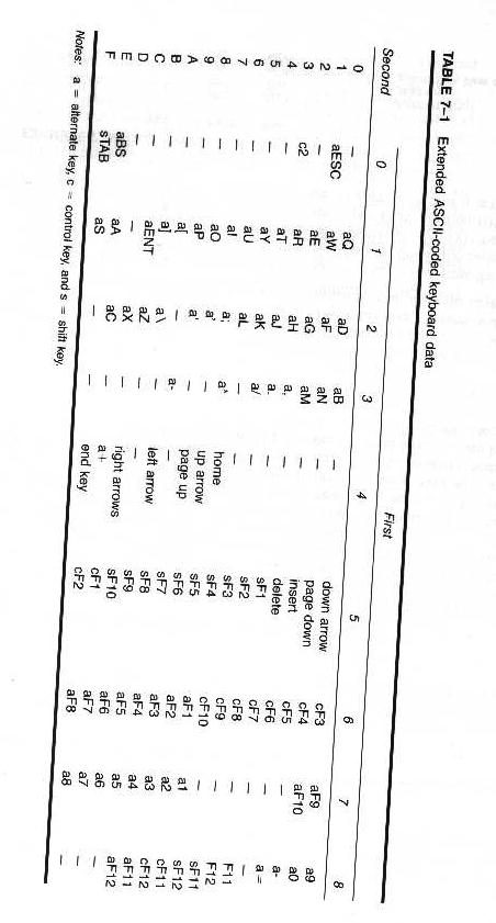 In aplicatiile actuale ( editoare de texte, programe de baze de date, programe de grafica,..) se folosesc foarte des caractere functionale( Extended ASCII- Coded Keyboard Data) , care sunt filtrate de catre functiile DOS de citire si afisare sir de carctere (09H, 0AH, 01H, 02H). Codurile acestor caractere se suprapun peste codurile caracterelor ASCII uzuale. Din aceasta categorie fac parte tastele functionale F1..F12, sagetile, PageUp, PageDown,End, Home, Del, Shift +Fi, ESC si caracterele insotite de CTRL (Controle) si ALT (Alternate). Numarul acestor coduri este foarte mare si pentru citirea lor in registrul AL fara a fi filtrate se utilizeaza functia 06H din DOS si se seteaza DL=0FFH. La receptia unui caracter functional AL=00 si trebuie apelata inca odata functia DOS (INT 21H) cand se primeste codul caracterului ce se va interpreta prin program ca un caracter functional. Pentru functia 06H nu se asteapta apasarea unei taste. Prin program trebuie testat daca s-a apasat o tasta lucru indicat prin Z=0. Cat timp Z=1 se asteapta prin ciclu de apel.
