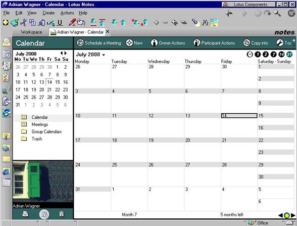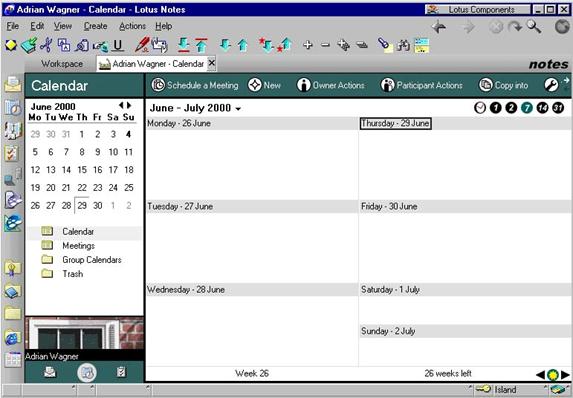Notes 5.0 ofera mai multe posibilitati pentru a va vizualiza calendarul. Puteti sa va verificati programul utilizand cinci tipuri de afisari: zilnic, doua zile, o saptamana, doua saptamani sau o luna. View-urile calendarului sunt similare cu interfata Lotus Organizer. Figura urmatoare va prezinta afisarea unei saptamani: