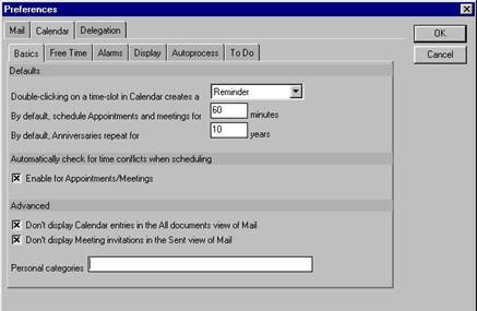 Aceasta sectiune este folosita pentru a defini implicit tipul de intrare in calendar si durata. Mai puteti defini cati ani de acum inainte o aniversare este afisata in calendar. De asemenea puteti preveni aparitia documentelor din calendar in view-ul All Documents, precum si afisarea invitatiilor in view-ul Sent.