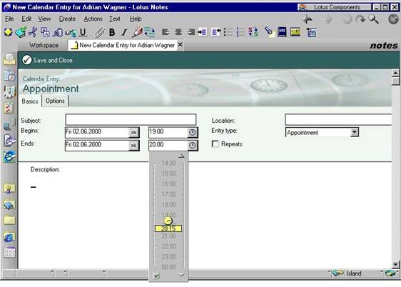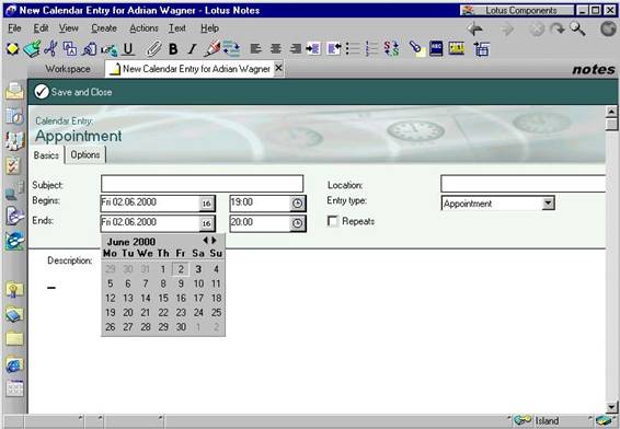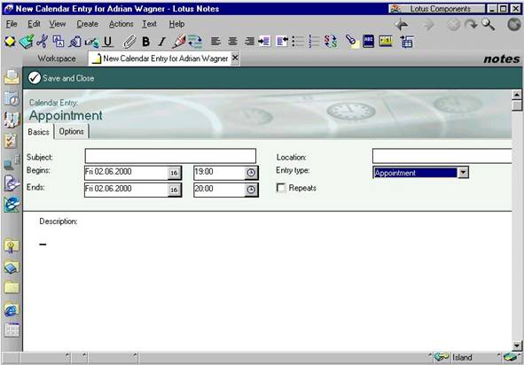 Deschideti baza de date Mail si selectati Create - Calendar Entry. Formularu tipului de intrare implicit va fi afisat. Selectati tipul dorit in campul Entry type - de exemplu Appointment.
