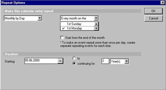 Daca validati campul Repeats, o fereastra de dialog va fi afisata, in care puteti stabilii regulile de repetare a intalnirii. De exemplu, puteti programa cate o intalnire a biroului de Sales in fiecare marti de la inceputul fiecarei luni, pe urmatorii doi ani. Aceasta fereastra de dialog este ilustrata in figura 6. In momentul cand salvati o intalnire care se repeta, Notes va crea automat intrari in calendarul dumneavoastra pe intreaga perioada specificata.