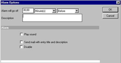 Alarms Puteti valida alarme pentru tipurile de intrari in calendar. Daca o alarma este activa, va apare o notita de avertizare pe ecran cu o perioada de timp predefinita (setata tot de dvs.) inaintea evenimentului, unde puteti vedea o descriere scurta a ceea ce aveti de facut. Puteti seta si un avertisment sonor.