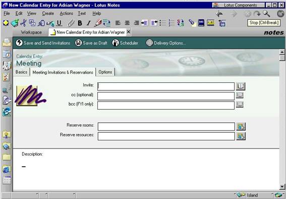 Folositi formularul Meeting Calendar Entry pentru a stabili un meeting si a invita persoane la el. Prima pagina a formularului este relativ identica cu cea a intalnirii, dar sunt si cateva deosebiri datorate specificului intrarii in a doua pagina a formularului, asa cum se vede in figura 8: