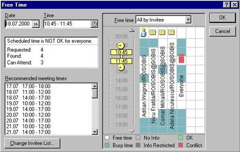 Verificarea disponibilitatii Cand apasati butonul Scheduler din bara de actiuni si apoi Check All Schedules, veti obtine caseta de dialog Free Time. Puteti muta timpul pe bara respectiva pana cand gasiti o perioada cand toti cei vizati sunt disponibili: