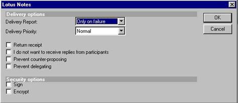 Optiuni de expediere - Delivery Options Apasati butonul Delivery Options pentru a stabili modul in care invitatiile trimise vor fi gestionate. Puteti sa-i spuneti sistemului ca nu doriti raspunsuri de la invitati. In acest caz, ramane la latitudinea lor daca sa confirme sau nu. Puteti semna sau cripta invitatiile (ca si la email). Puteti sa restrictionati invitatii in a delega pe altcineva la meeting sau sa propuna modificari. Aceasta fereastra de dialog o puteti vedea in figura 10: