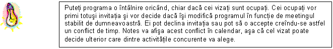 Puteti astfel sa gestionati toate evenimentele si intalnirile din organizatie. Cand invitati persoane la o sedinta, Notes va trimite mesaje acestora, care vor opta pentru acceptare sau nu. Notes mai poate gestiona si resursele comune, cum ar fi o sala de sedinte sau un retroproiector.