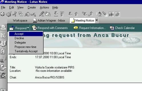Daca aveti nevoie de detalii suplimentare, apasati Request Information. Un memo va fi trimis automat initiatorului meetingului care poate reveni cu detalii.