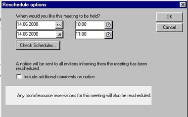 Reprogramare - Reschedule In acest caz, o fereastra de dialog va va fi afisata, de unde puteti sa alegeti noua perioada de desfasurare si sa reverificati timpul celorlalti pentru noua perioada (vezi figura 12). Cand aceasta reprogramare este salvata, veti avea pe ecran un nou memo, deja adresat participantilor, avand ca subiect reprogrmarea intalnirii. Dupa ce este trimis, calendarele destinatarilor vor fi automat modificate cu noua perioada.