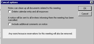 Cand anulati un meeting, o fereastra de dialog va permite sa stergeti intrarea respectiva din calendarele participantilor si sa eliberati resursele rezervate cu aceasta ocazie. De asemenea, un mesaj va fi trimis automat tuturor participantilor.