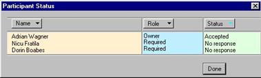 In acest caz, o fereastra de status va fi afisata, ca in figura 1 Puteti naviga prin lista participantilor, vizualizand astfel cine a acceptat si cine nu, cine a propus o noua perioada, etc. Puteti sorta numele participantilor prin click pe capul de tabel, sau puteti sorta raspunsurile lor. Deasemenea, vedeti persoanele a carei prezenta este obligatorie sau optionala.