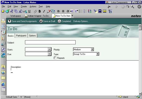 Va puteti gestiona activitatile zilnice, sau puteti gestiona activitatile altora folosind lista de To Do, facilitate oferita de Notes R 5. Formularul pentru To Do seamana foarte mult cu o intrare in calendar, dar in plus ofera si campuri suplimentare cum ar fi prioritate si status. Acestea va ajuta sa urmariti activitatea pana cand este finalizata.
