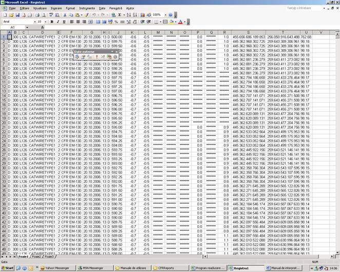 Deoarece este folosit un singur document Repindat.con, in documentul upload cu extensia DATA generat de aplicatia geom.cfg se vor salva si valorile parametrilor alocati pentru sina, astfel pentru canalele 15,16,21 si 22 vor fi salvate valorile pentru suprainaltarea relativa, torsiunea in baza de 2,5 m, nivelul in lung dreapta si stanga, iar in documentul upload cu extensia DATA generat de aplicatia rail.cfg se vor salva si valorile parametrilor alocati pentru geometria caii, astfel pentru canalele 3,4,5 si 6 vor fi salvate valorile pentru curbura si raza. Dupa importarea in documentul excel aceste coloane se vor sterge.