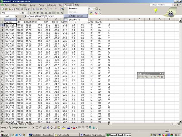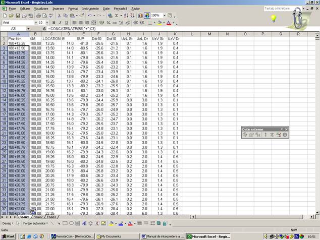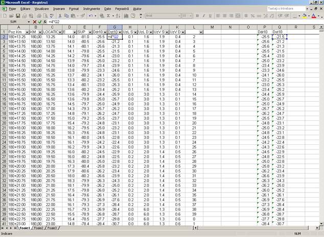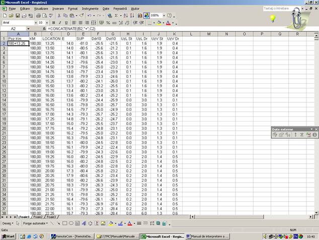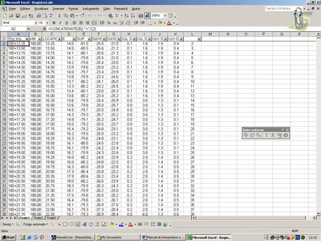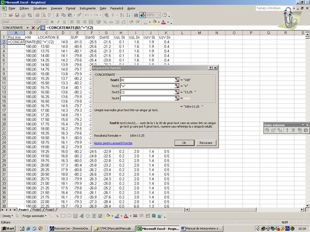 Se insereaza o noua coloana la capatul din stanga al tabelului cu denumirea POZ Km, in care se introduce formula: =CONCATENATE(B2;"+";C2). Aceasta formula este necesara pentru a pune in aceeasi celula pozitia kilometrica si pozitia hectometrica. Formula se repeta pana la sfarsitul coloanelor cu date.