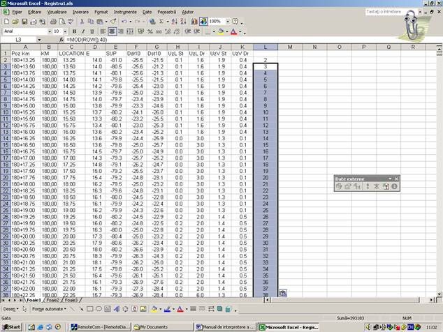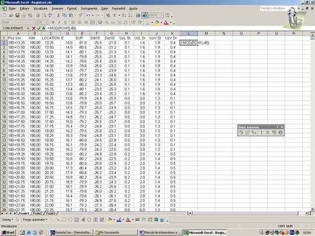 Se insereaza o noua coloana la capatul din dreapta al tabelului cu denumirea Locatie, in care se introduce formula: =MOD(ROW();40)(daca nu merge cu (;) se pune doar (,) ). Aceasta formula este necesara pentru a putea numerota ciclic 40 de masuratori, ceea ce inseamna faptul ca daca selectam tot a 40 a masuratoare se selecteaza valorile masurate din 10 in 10 m.