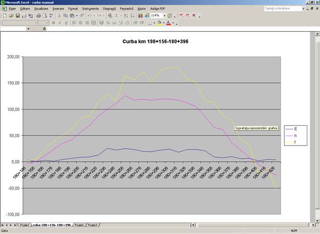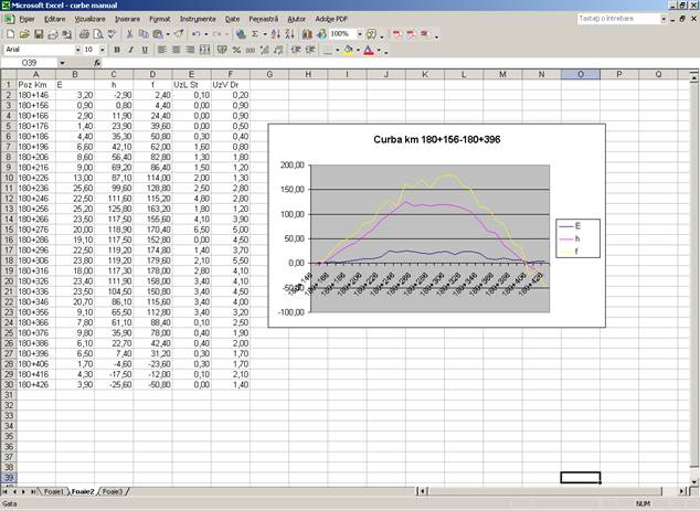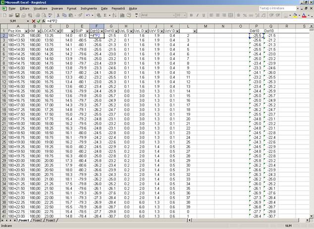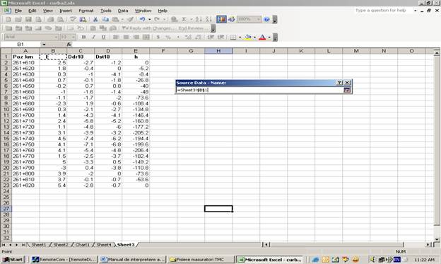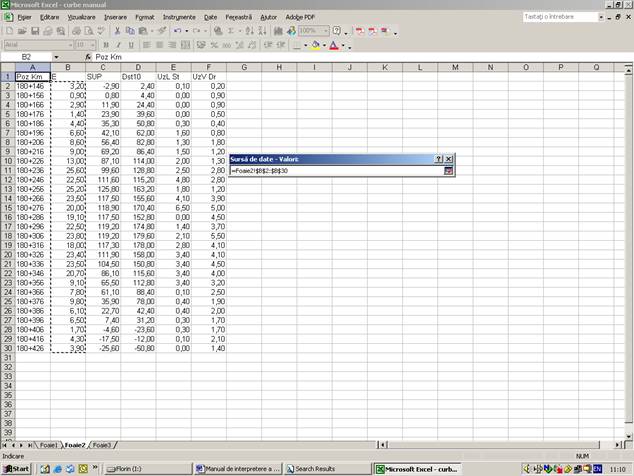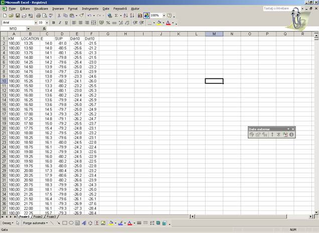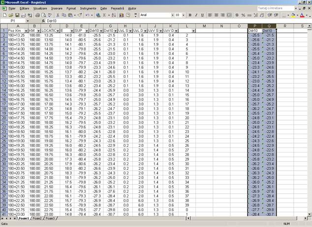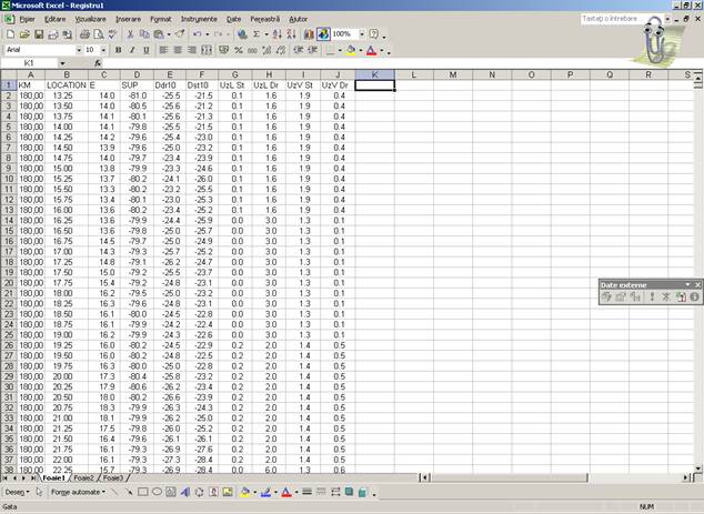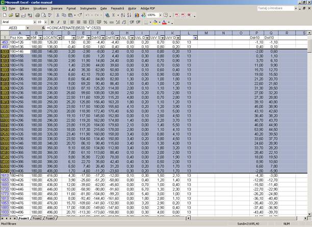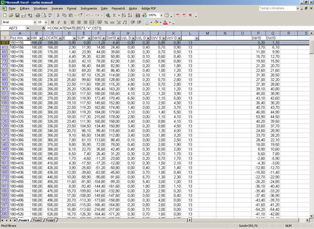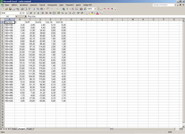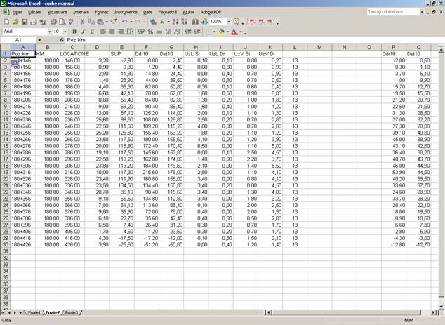 Se pastreaza doar coloanele Poz Km, E, Ddr10, Dst10, h, UzVdr, UzVst, UzLdr si UzLst (corespunzatoare sensului curbei). In exemplul de fata curba este de dreapta deci se pastreaza coloanele Poz Km, E, Dst10, h, UzVdr si UzLst