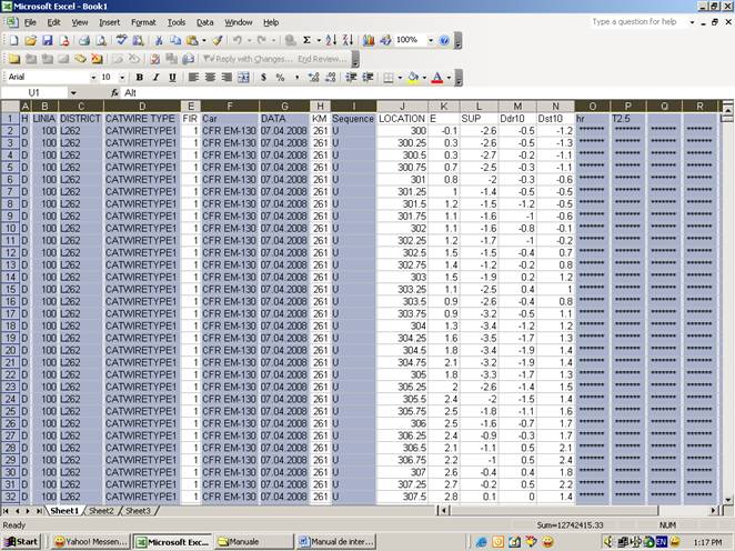 Deoarece este folosit un singur document Repindat.con, in documentul upload cu extensia DATA generat de aplicatia geom.cfg se vor salva si valorile parametrilor alocati pentru sina, astfel pentru canalele 15,16,21 si 22 vor fi salvate valorile pentru suprainaltarea relativa, torsiunea in baza de 2,5 m, nivelul in lung dreapta si stanga, iar in documentul upload cu extensia DATA generat de aplicatia rail.cfg se vor salva si valorile parametrilor alocati pentru geometria caii, astfel pentru canalele 3,4,31 si 32 vor fi salvate valorile pentru curbura si raza. Dupa importarea in documentul excel aceste coloane se vor sterge.