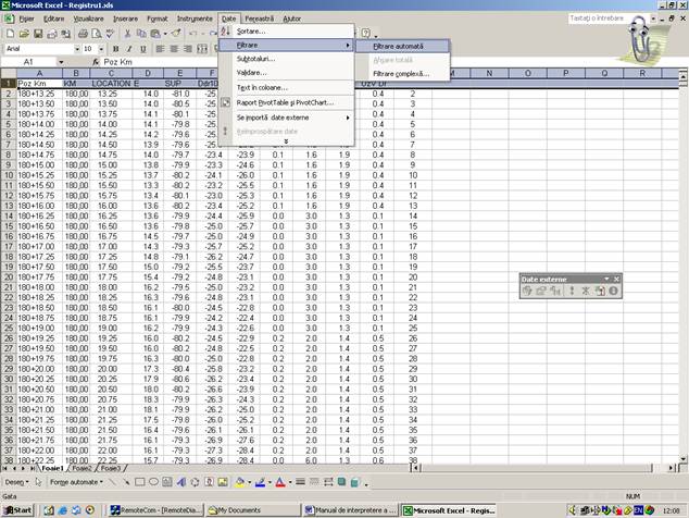 Pentru a putea alege masuratorile dorite se selecteaza primul rand, iar din meniul DATA se cauta FILTRE si apoi se da comanda AUTOFILTRE: