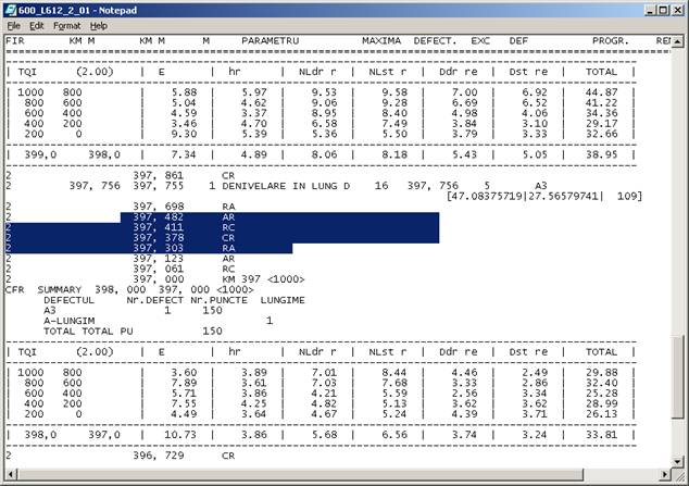 Raportul DATA genereaza un document upload prin care sunt salvate valorile parametrilor alesi in documentul Repindat.con, din 25 in 25 cm.