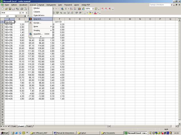 Se selecteaza randurile aferente curbei. Pentru acuratete se selecteaza cu 3 valori inainte si dupa punctele caracteristice ale curbei (3 masuratori inainte de AR si 3 masuratori dupa RA) si impreuna cu capul de tabel se copiaza intr-un alt sheet (foaie).