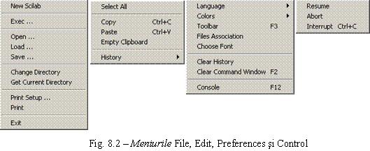 Meniul Preferences contine comenzi pentru modificarea aspectului si a modului de lucru ale mediului SCILAB.