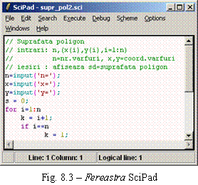Ferastra SciPad permite incarcarea, editarea si salvarea unui (sub)program, care poate fi lansat in executie din fereastra de comenzi (Exec). Desigur, aceste operatii se pot face si in ferestra de comenzi, dar in conditii nu tocmai comode.