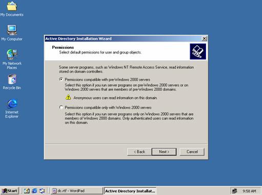 8)In continuare alegem optiunea 'Permissions compatible with pre-Windows 2000 Servers'.