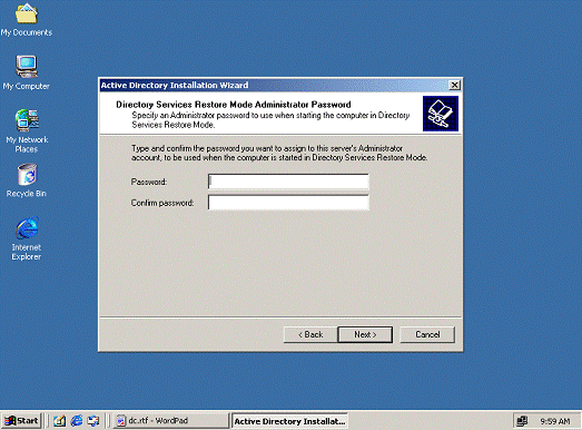 9)Windows 2000 are posibilitatea de a-si salva configuratia('System State Data') dar restaurarea Active Directory se face intr-un mod ales la startarea calculatorului numit 'Directory Services Restore Mode' care e protejat cu o parola care poate fi diferita de cea a administratorului de domeniu.