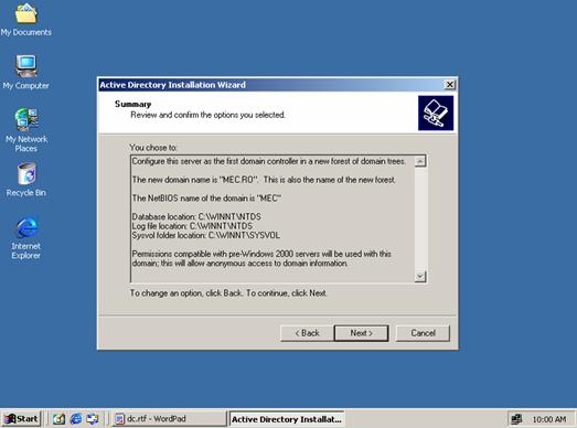 10)Se vor afisa in final optiunile alese in timpul wizard-ului dupa care va incepe promovarea propriu-zisa cand vor incepe sa se creeze obiectele,permisiunile si celelalte setari de securitate necesare intr-un domeniu Windows 2000.