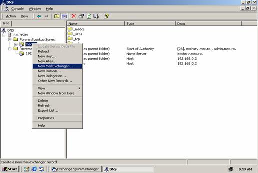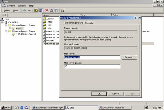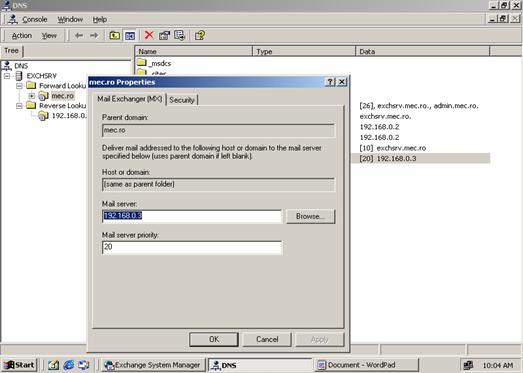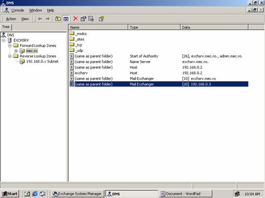 In final cele doua inregistrari trebuie sa apara in consola DNS evidentiindu-se costurile pentru fiecare calculator de Exchange in parte si toleranta la nefunctionarea unuia dintre ele.