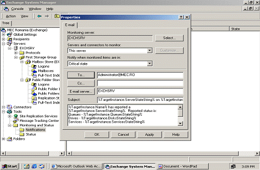 -'Monitoring and Status' este specific Exchange 2000 si are doua console ce se pot vizualiza in Exchange System Manager' si anume:'Notifications' si 'Status'.Primul este pentru trimiterea avertizarilor iar cel de-al doilea pentru evenimente critice ce afecteaza functionarea corecta a programului.