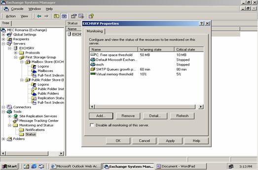 -in fereastra 'Monitoring'-click 'add'-adaugam tipurile de evenimente de monitorizat si anume: oprirea neprevazuta a unor servicii de Exchange,cresterea numarului de mesaje in cozile de asteptare, folosirea memoriei, atingerea limitei spatiului pe disk etc.